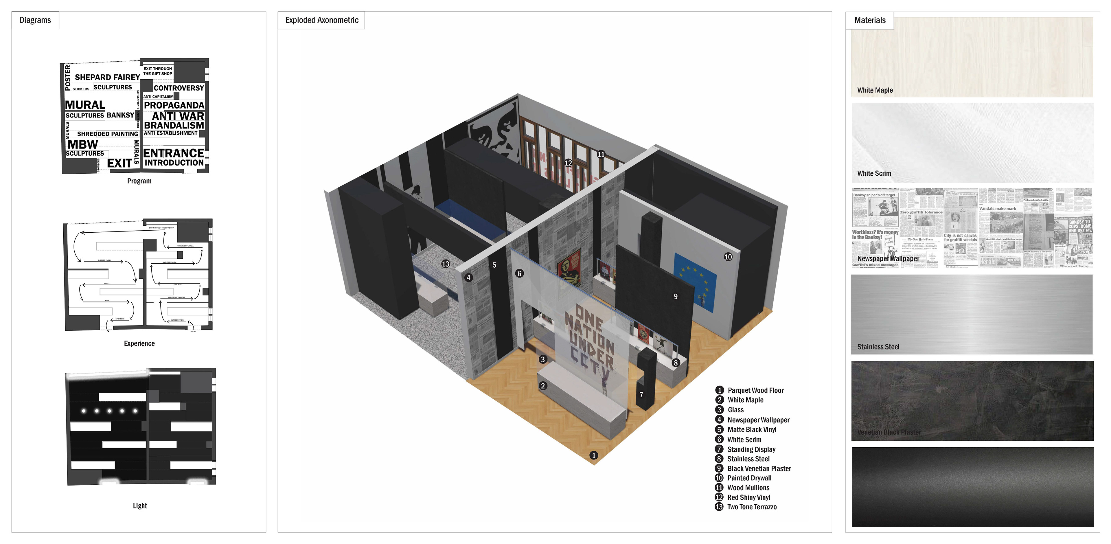 In 2019, my School of Architecture was specially invited by the Venice Architecture Biennale to create an exhibition featuring some of the work from the studios, and to be designed by my interior design studio. Inspired by the project, my professor tasked us with building a temporary pop-up exhibition over a subject of our choosing. We were to base our concepts over our subject to create a design that will be a temporary exhibition in Palazzo Bembo, Venice, Italy. Contrasting to the Venetian Gothic style, I thought it would be fun and ironic to showcase Banksy, the notorious graffiti artist whose identity is still unknown to the world. Juxtaposition, irony, and of course, "brandalism", were all an important role in my tribute to this controversial art icon.