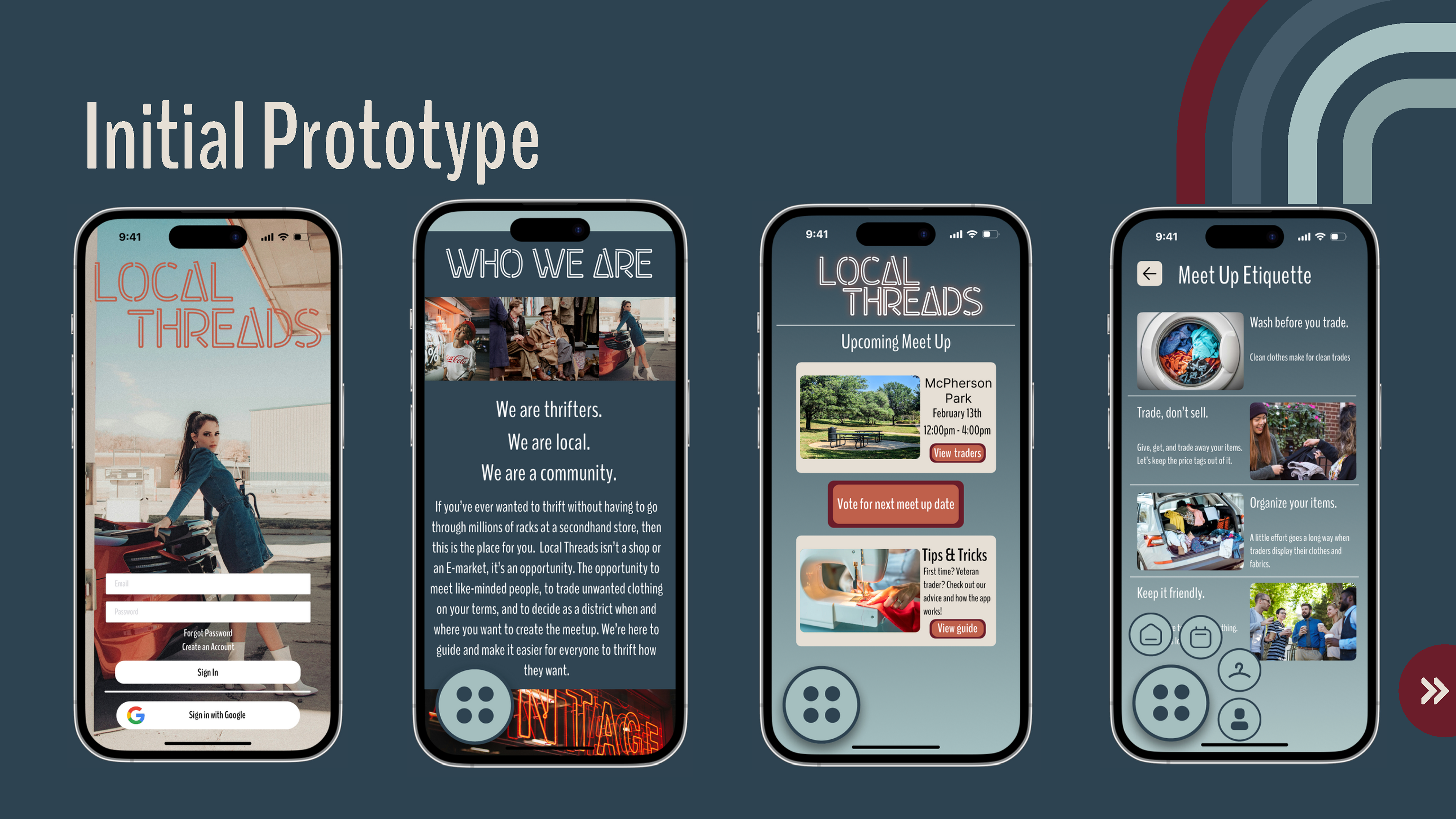 As part of the final project, I was partnered in a group with Jackson Hawkins, Rebecca McSweeney, & Elijah Hull, where I opted to take on the role of UI Lead. As a collaborative effort, we agreed to create an application that would allow for a more sustainable & social effort in vintage clothing trades, and thus, Local Threads was created.
